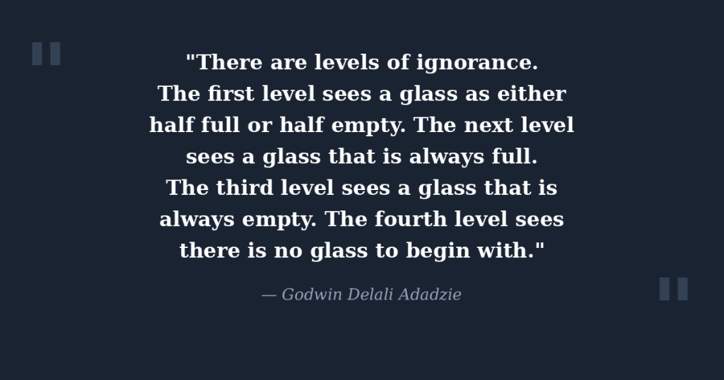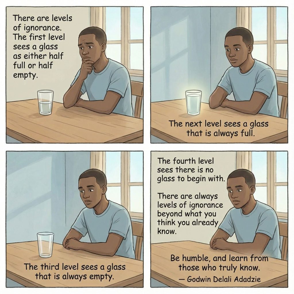 “There are levels of ignorance. The first level sees a glass as either half full or half empty. The next level sees a glass that is always full. The third level sees a glass that is always empty. The fourth level sees there is no glass to begin with. There are always levels of ignorance beyond what you think you already know. Be humble, and learn from those who truly know.”