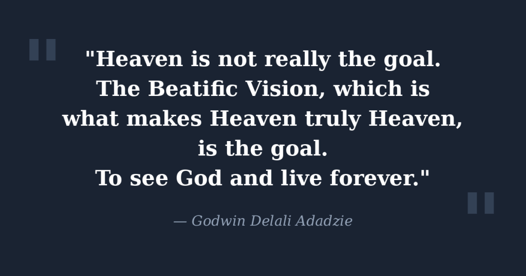 “Heaven is not really the goal. The Beatific Vision, which is what makes Heaven truly Heaven, is the goal. To see God and live forever.”